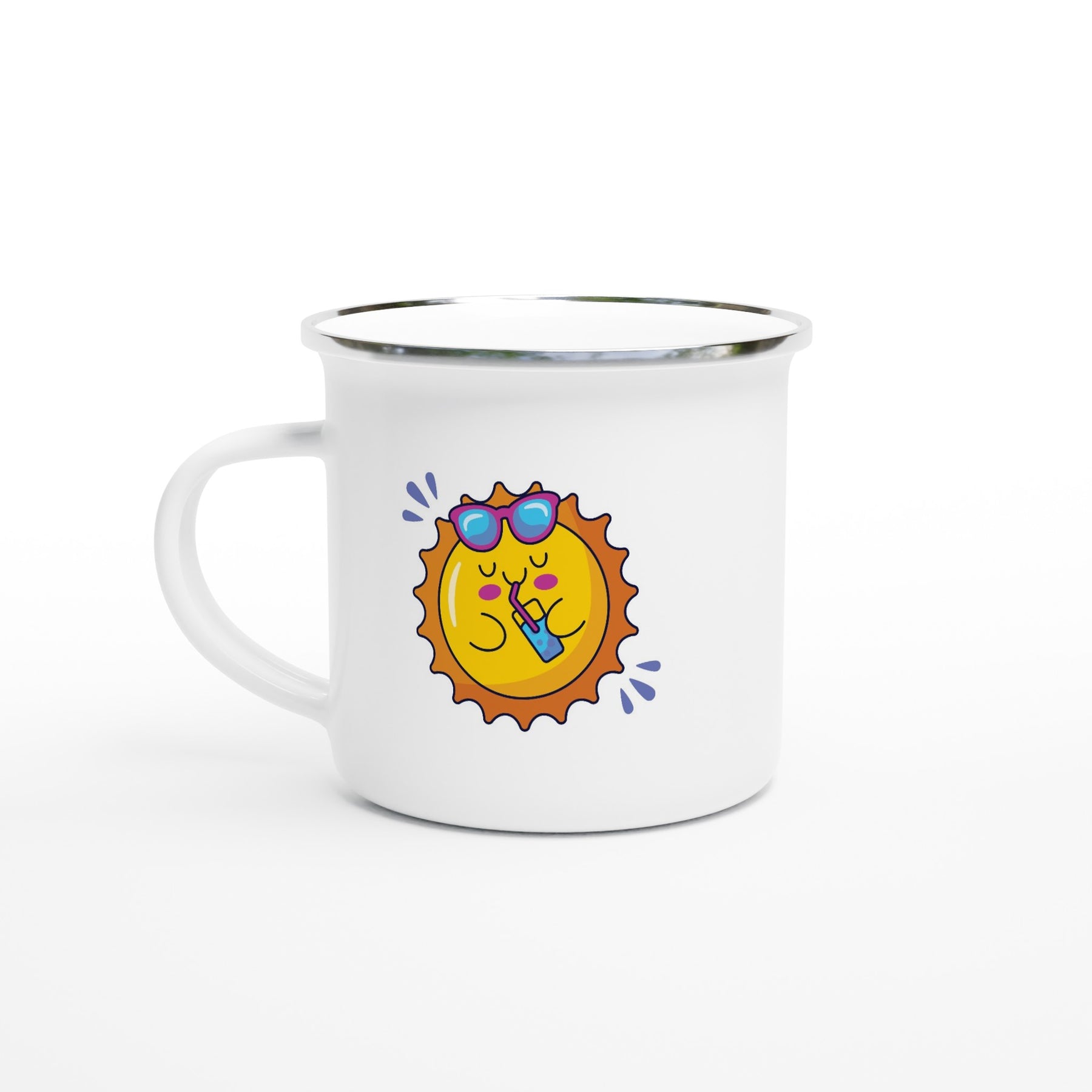 Sol med solglasögon sippar på sin drink på emaljmugg till barn